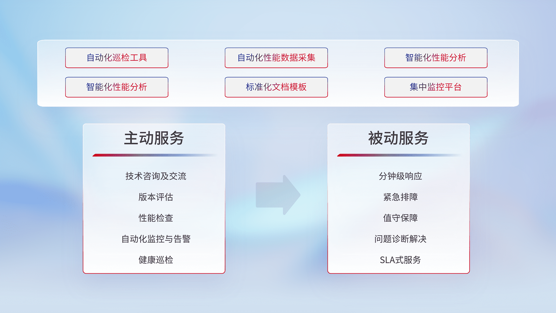 智能化工具和标准化文档,,,保障服务质量,,,提供主动服务(包含技术咨询、、版本评估、、性能检查、、、自动化监控与告警、、、、健康巡检)和被动服务包含(分钟级响应、、紧急排障、、、、值守保障、、问题诊断解决、、、SLA服务)。。。。